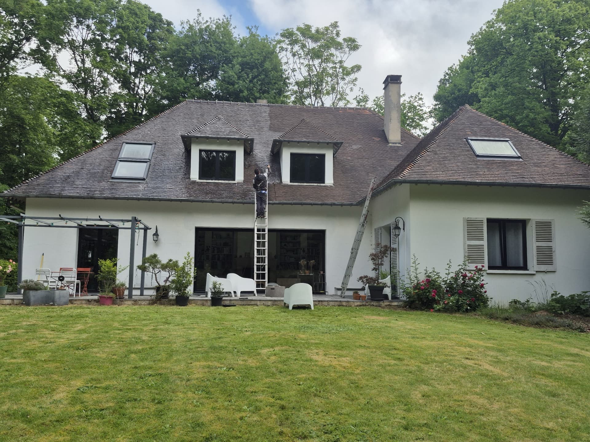 Nous avons effectué le nettoyage de la toiture de cette maison, et appliqué un produit hydrofuge de manière à améliorer sa résistance aux intempéries.